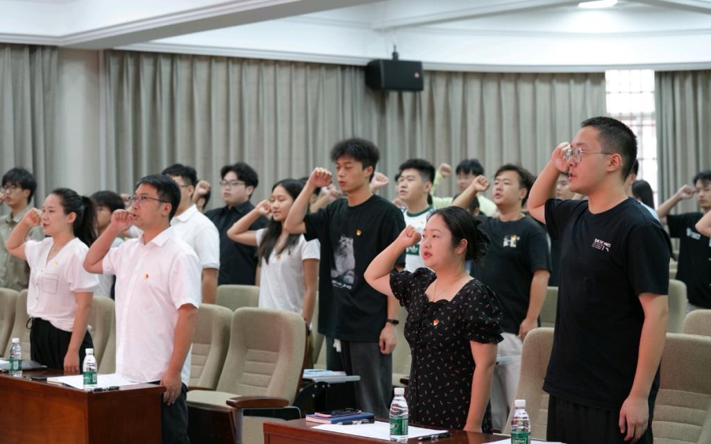 大会伊始,学生党支部举行新发展党员入党宣誓仪式。经上级党委审批通过的 32 名新党员整齐列队,面向党旗,庄严宣誓。随后,学生党员集中观看思政课录制视频《弘扬伟大抗战精神做光荣自豪中国人》,重回烽火岁月,聆听英雄故事,感悟众志成城。接着,支部学生党员代表周圣格、熊健源依次上台讲学了“以伟大抗战精神铸魂育人,以教育家精神强师筑梦”为主题的微党课。党建辅导员易芙蓉对学生微党课进行点评并就新学期学生党建和党支部工作进行了布置和安排。