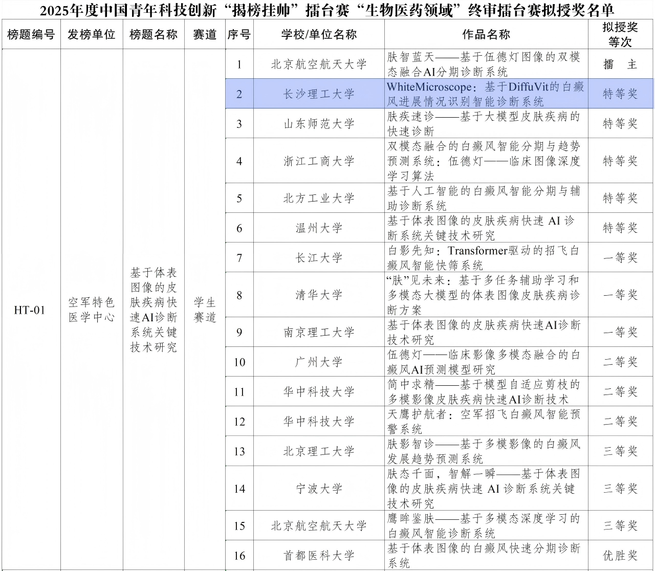 本次“生物医药领域”终审擂台赛聚焦生物医药科技前沿,围绕动物疫苗、生物发酵、合成生物等大方向发布15个榜题,精准覆盖“生物医药领域”多项技术瓶颈。由物电学院王新、王威老师指导的学生团队凭借“whitemicroscope:基于diffuvit的白癜风进展情况识别智能诊断系统”,在清华大学、华中科技大学等全国顶尖高校组成的279支队伍中脱颖而出,成功斩获“生物医药领域”主擂台赛特等奖。